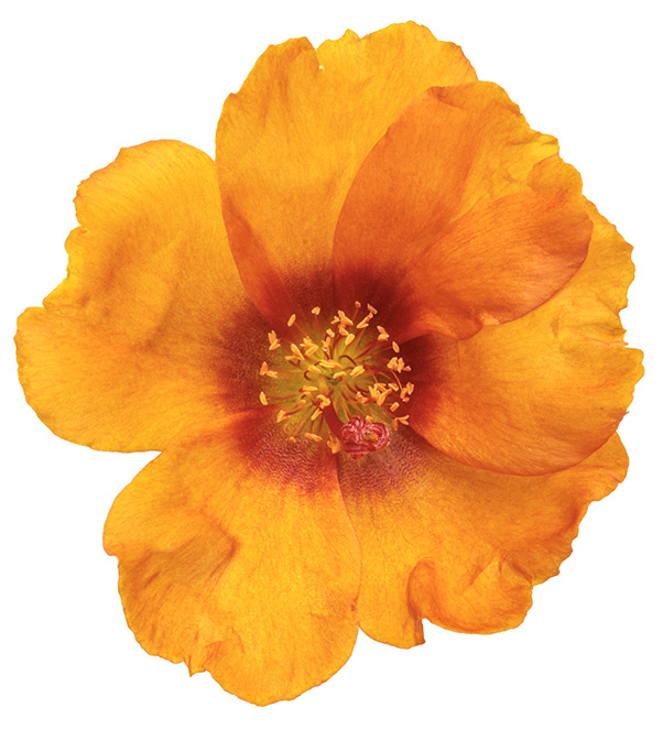 Expanding the color range for Mojave® Portulaca, this novel cultivar shines with large, bright mango colored blossoms with a narrow scarlet ring around the center that creates a bullseye for pollinators. Like others in the series, it delivers a stellar garden performance all season.