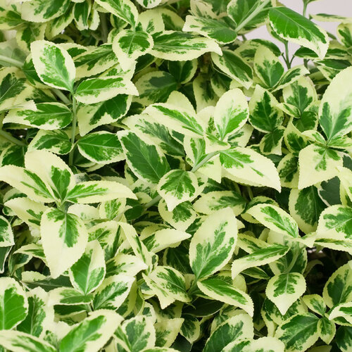 White Album® euonymus is an improved form of the always-popular 'Emerald Gaiety' with superior leaf spot resistance and a consistent growing habit. Landscapers and gardeners will appreciate the bright leaves that set it apart from older varieties. The stable variegation has a large, cream-colored border around the perimeter of the large evergreen leaves. Very nice for brightening up shady areas!
